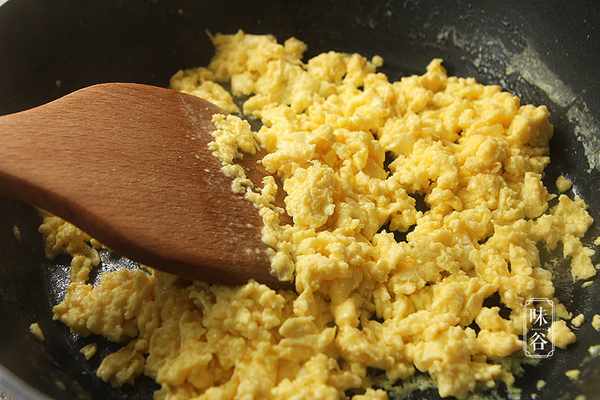 2、先將雞蛋炒好,起鍋燒油,油熱以後到入雞蛋,蛋液翻炒至稍微凝結,用筷子攪碎盛出備用,雞蛋別炒太久。