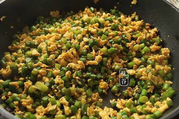 3、重新起油鍋下蒜苔炒至稍微蔫蔫的,蒜苔斷生後放入黃豆醬調味,或者放生抽和鹽。下入之前炒好的雞蛋翻會兒即可,拌在米飯裡吃很下飯。