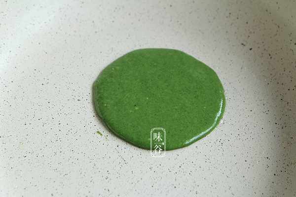 3、平底鍋倒油熱鍋,一勺菠菜面糊倒入平底鍋,使面糊攤開成圓形,開小火慢烙,一面凝固後翻面繼續烙一會就可以瞭。