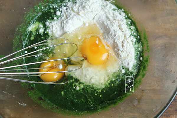 2、菠菜泥放入雞蛋和適量面粉,攪拌成酸奶一樣的面糊,根據個人喜好放入鹽或者白糖調味;