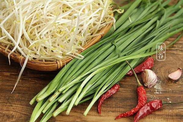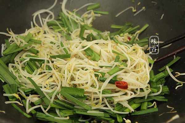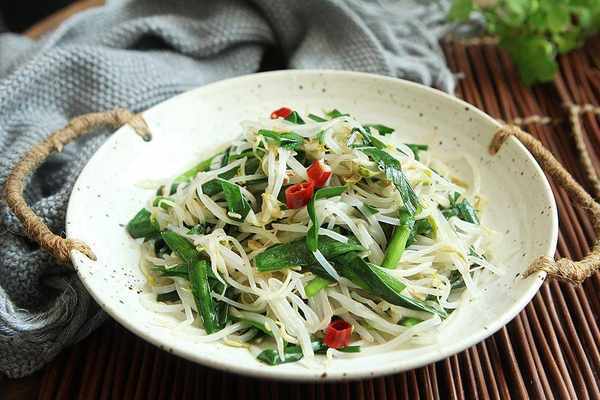 【食材】:豆芽 適量、韭菜 適量、雞精 少許、香醋 1勺、大蒜 2瓣、幹辣椒 少許、食鹽 1小勺、