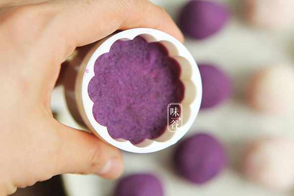 3、紫薯和山藥分成相同大小並搓成圓球,放進月餅模(模具內刷上油方便脫模),一半紫薯泥,一半山藥泥,壓成花型糕點。