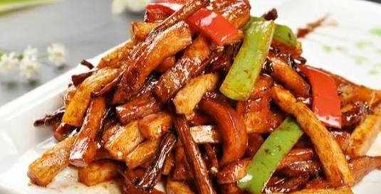 1.先將松板肉切成條,用鹽,黃酒醃制半小時。
