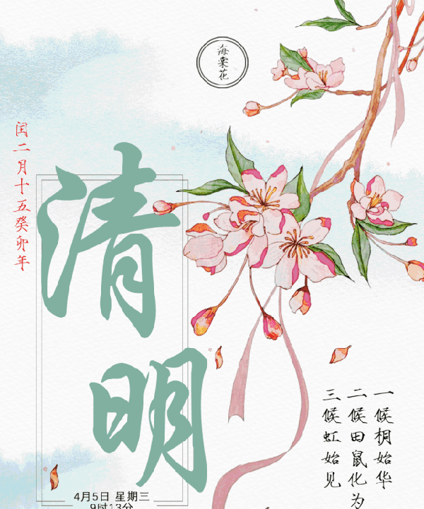 清明在仲春和暮春之交,春意已濃。這個時候,掃墓祭祖,踏青郊遊,是自古傳承的傳統習俗。此時天氣的變化,也讓物候隨之變化。