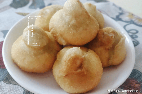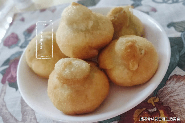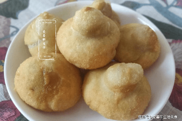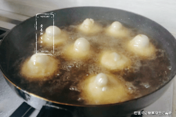 第六步,翻面。在熱油的作用下,小餅一個個變成葫蘆的形狀,外皮焦脆,裡面變空,然後給它側過來,煎至四面金黃。