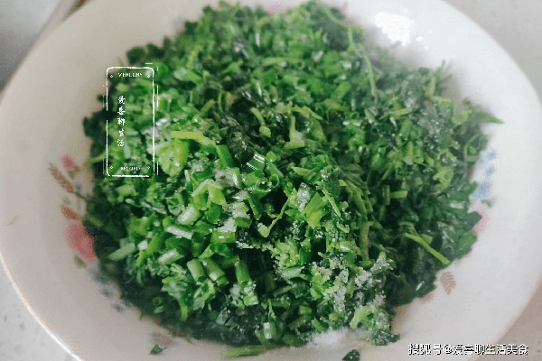 第一步,苜蓿焯水。去菜園子裡,把苜蓿的嫩頭剪下來,清洗幹凈後,控幹水分,鍋中燒水,水開後放入苜蓿,焯水2分鐘後撈出。苜蓿要多剪一點,因為做餡料要比較多一點,做不完還可以當菜吃。