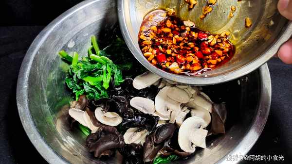 第四步:將木耳菜撈出來擠幹水分放入空碗中,再將焯燙後的木耳和蘑菇也加進去,最後將調好的料汁倒進去,下手抓拌均勻就可以擺盤上桌享用瞭。