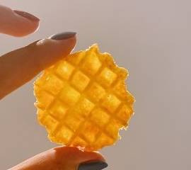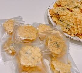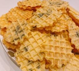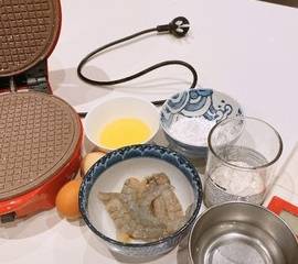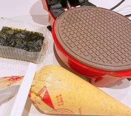 9.在網格烤盤上選擇好距離擠入大概一塊錢硬幣大的蝦面糊一次大概可以做5~6個然後蓋上鍋大概變金黃色就可以出鍋繼續下一批啦。