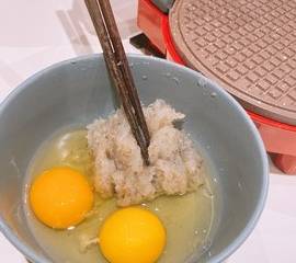 4.在剁好的蝦泥中打入兩個雞蛋順時針攪拌。