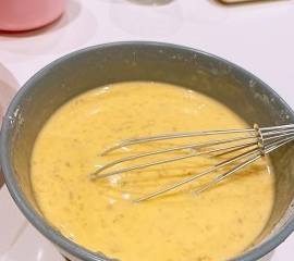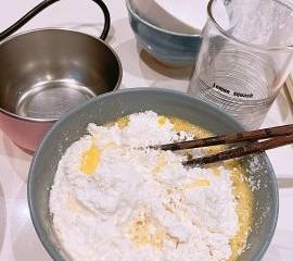 6.把低筋面粉玉米淀粉橄欖油水全部倒入蝦泥糊糊中順時針攪拌。