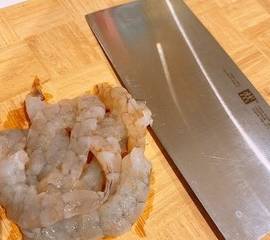 3.鮮蝦剁成蝦泥當然也可以選用料理機或者輔食機打碎但阿嬤是覺得就這麼點大蝦沾在機器壁上的都比刮下來的多還是上刀剁吧耐心些。
