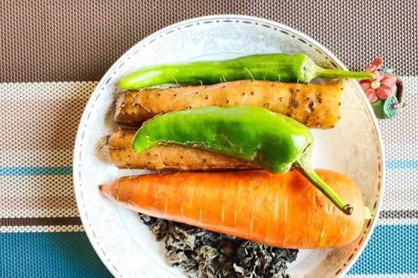 (一)、黑木耳提前半個小時放在清水中泡發,去掉硬根後反復淘洗兩遍,瀝水備用,胡蘿卜和山藥洗凈表皮的泥土,去皮之後切成薄片。