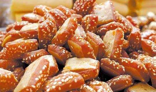 第2種蜜三刀。蜜三刀是山東最有傳統特色的一種糕點小吃,它的外觀非常小巧味道,甜甜的一點也不膩,上面灑著白色的芝麻,一口咬下去濃濃的香味,再加上蜜漿的甜味兒在嘴裡面回味無窮。正宗的蜜三刀需要經過很多復雜的工序才能夠制作出來的,加上多年的傳承和改善,密山道的味道也是非常不錯的,口感綿軟,老少都非常喜歡吃。