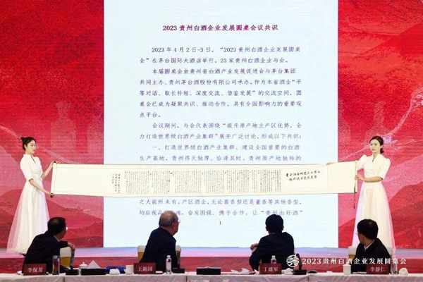 23傢企業還發佈瞭《2023貴州白酒企業發展圓桌會議共識》。就“打造世界級白酒產業集群、建設全國重要的白酒”“維護茅臺的‘美’和‘好’,是貴州白酒的共同責任。”“珍惜原產地獨特釀造環境,千方百計保護好支撐貴州白酒可持續發展的生命線。”“維護產區商業聲譽,共同呵護好來之不易的貴州白酒金字招牌。”“貴州白酒上升周期仍在持續,產區品牌張力將越來越強。”簽署發展宣言。