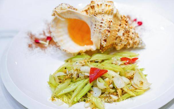 【黑松露響螺片】:螺片爽脆味美,搭配西芹百合和黑松露,中西結合,完美融合,口感層次豐富。
