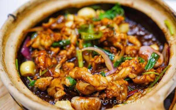 意猶未盡,我們又點瞭另外一道有異曲同工之妙的啫啫田雞。砂鍋的儲熱功能極強,能瞬間將食材表面烹熟,快速鎖住水分,再配以蔥薑蒜和各種醬汁爆香,出鍋淋少許黃酒爆燃,香氣火爆,口感極脆嫩。