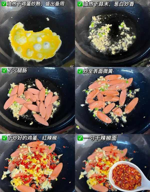 1:首先我們將雞蛋炒散備用,另起鍋燒油放蔥蒜爆香,加入我們切好的火腿腸炒熟之後放入炒好的雞蛋和紅辣椒,我喜歡爆辣的那種感覺,所以又加瞭一勺幹辣椒面!