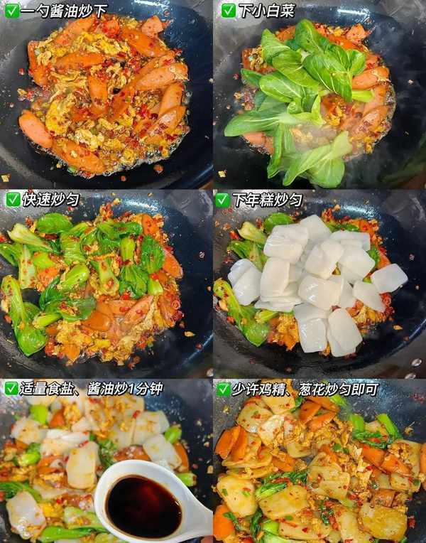 2:來點醬油先調個味,然後再加入小白菜,斷生之後加入年糕,年糕可以提前用清水洗一下,這樣炒起來不容易粘鍋,炒熟之後來點醬油、雞精和蔥花調味,大火翻炒兩下之後準備出鍋!