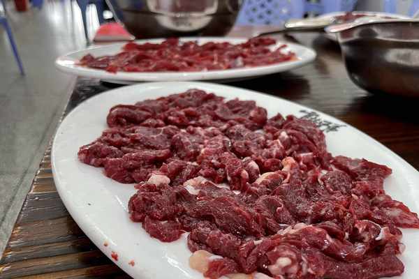 刀工瞭得的師傅把牛肉切成薄片,很多部位供我們選擇,嫩肉、吊龍、胸口油等等,每一種口感都不同,但都很鮮嫩(點鍋底時可以加上牛丸)。涮好的牛肉沾上沙茶醬,鮮香味美,蔬菜是免費的,一頓正宗潮汕牛肉火鍋好吃不貴。