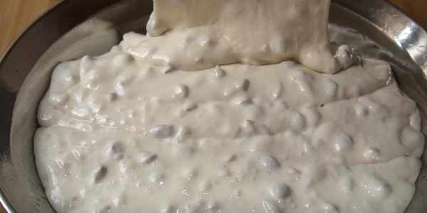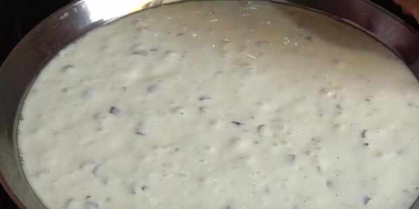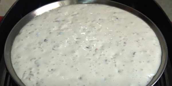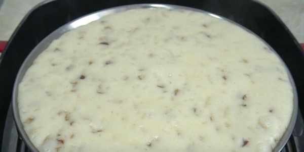 5.準備一個盤子,底部刷上沒有味道的油。倒入面糊。震動幾下把它晃動平整。