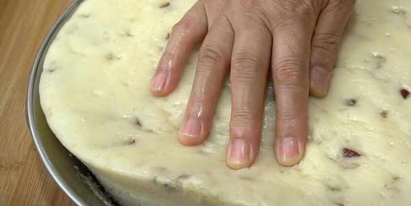 4.往裡面加入一把葡萄幹跟紅棗碎,把它們攪拌均勻,順便排氣。