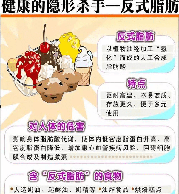 奶油面包口感好,香甜可口,可是裡面含有反式脂肪酸,當然在配料表中看不到反式脂肪酸的字樣,大傢仔細看發現“氫化植物油”或者“代可可脂”這些是反式脂肪出現的名字,植物黃油其實就是一整塊反式脂肪,含有反式脂肪的食品還有,帶酥皮的面包,如法式牛角、帶酥皮的點心或者奶油蛋糕、奶油面包;蛋黃派或草莓派;大部分餅幹;泡芙、薄脆餅、油酥餅、麻花;代可可脂巧克力制品;沙拉醬;人造奶油冰激凌;咖啡伴侶或速溶咖啡及方便面等。事實上,隻要用花生油、玉米油或其它常用植物油來高溫油炸食品,就會不可避免的產生反式脂肪。