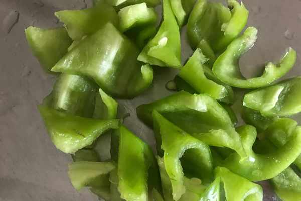 ③、把一個尖椒洗凈,去蒂去籽,切成滾刀塊。