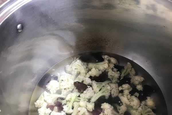 ⑦、起鍋燒水,水中加入一小勺鹽,幾滴花生油。水開以後下入菜花和木耳焯水半分鐘。焯水的時候加入鹽能使蔬菜增加底味。加入幾滴食用油,能使蔬菜的顏色更鮮艷。