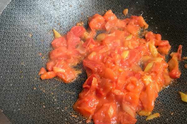 ⑨、重新起鍋燒油。把花生油燒熱以後,先加入蒜片炒香。然後再下入西紅柿炒出沙和紅油。