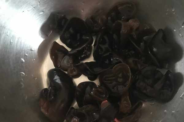 ②、把木耳提前用涼水泡發,大概需要五個小時。然後把泡好的木耳改一下刀,切小一點,便於食用。