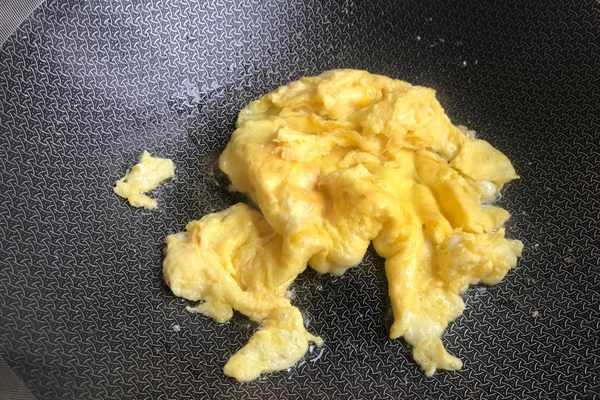 ⑧、起鍋燒油。花生油燒熱以後,下入蛋液,把雞蛋炒熟。然後盛出來備用。