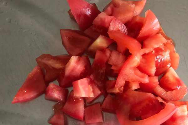 ④、把一個西紅柿洗凈去蒂,切成小塊。