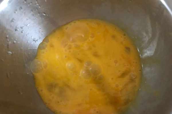⑤、把兩個雞蛋打入碗中,把蛋液攪打均勻。