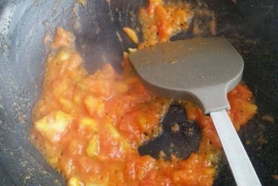 第四步:放入西紅柿,炒至炒好的西紅柿出湯時,倒入適量的水,撒適量的鹽,拌勻,大火燒開。