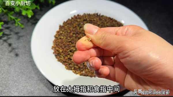 完全晾涼之後,現在我們取一顆花椒放在大拇指和食指中間,輕輕一搓,就細碎瞭,像這樣花椒就完全炒好啦。