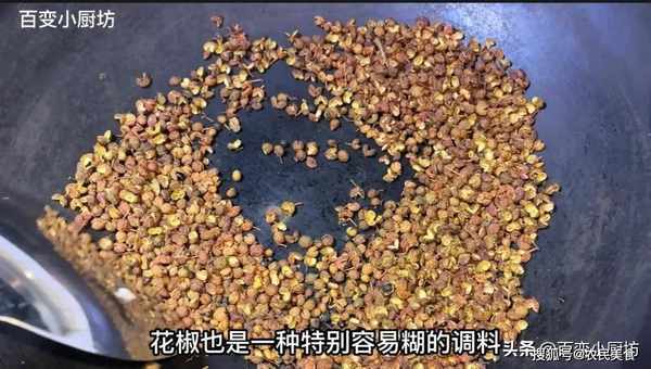 花椒也是一種特別容易糊的調料,所以在翻炒的過程中一定要耐住性子,不停的翻動,千萬不要偷懶,一偷懶花椒就炒糊瞭,炒糊瞭之後口感是苦的,而且也沒有任何的作用。大概炒到五分鐘的時候,花椒就完全炒幹瞭,現在顏色也變得更深,聞起來味道也非常的香。