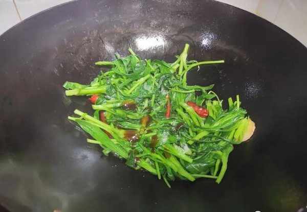 3.面條菜下鍋炒個10來秒鐘,它就會相對發軟,而且顏色很翠綠。食材炒好之後加上食鹽跟蠔油給調味一下,鏟子給它們炒均勻;