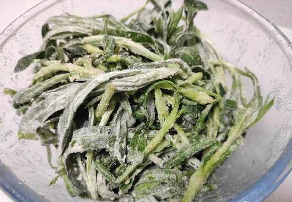 3.我們再往盆裡面倒入面粉,面粉下鍋之後,用筷子給它攪拌均勻。攪拌後使得整個面條菜的表面都能裹上一層面粉,攪拌好後的食材放在一旁備用;