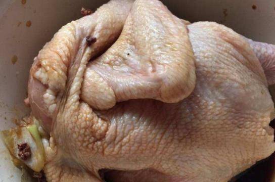 第三步:將整隻雞放入大碗中,加入適量的蔥、薑、蒜、鹽、蠔油、料酒、胡椒,拌勻,用手在雞肉上按摩。