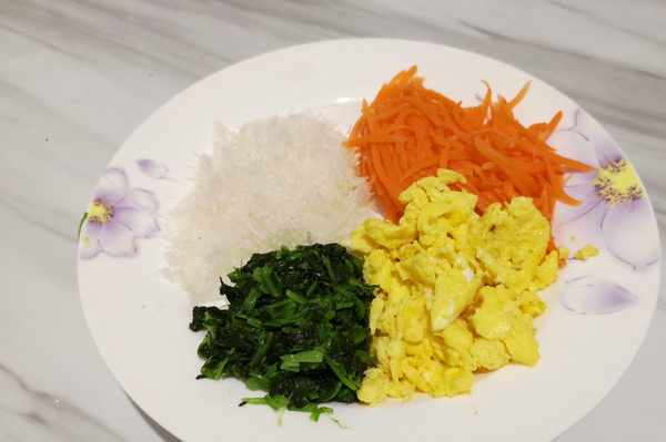 首先粉絲放入碗中,倒入溫水提前泡軟。粉絲泡軟後瀝幹水分,切碎;菠菜洗凈用開水焯燙好後,撈出擠幹水分,切碎;胡蘿卜去皮切成絲,加鹽擠幹水分;雞蛋倒入鍋內,用筷子快速攪拌,炒成雞蛋碎。這些菜都可以在頭天晚上處理好,這樣吃起來之後就更快速瞭。