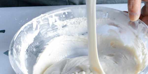 制作步驟:1:把糯米粉放到盆子中,加上酵母粉,面粉,糖,把它們攪拌均勻,然後把牛奶倒在糯米粉上,邊倒邊攪拌,一直把它們和成光滑細膩的糊狀,盡量多攪拌一會兒,裡面不要有塊狀的面疙瘩!