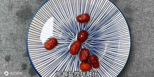 下面就跟著視頻一起來看看具體做法吧,準備六七顆紅棗加水,加一勺鹽,用手攪拌攪拌,把食鹽攪拌融化。