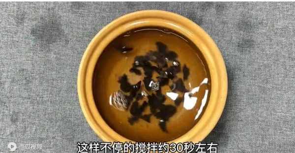 現在往裡面加入一勺面粉,利用面粉的吸附性,我們來洗木耳,可以很好的把木耳裡面的臟東西吸附出來,用手多抓洗一會兒。刷洗約一分鐘左右,我們可以看到裡面的水變得非常的臟。