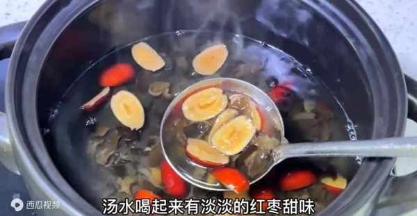 哇,真的是太香瞭,整個屋子彌漫著紅棗的香氣以及木耳的清香味,長時間的燉煮已經把紅棗裡面的甜味完全的註入到湯汁裡面瞭,現在裡面的紅棗吃起來軟糯香甜,糖水喝起來有淡淡的紅棗甜味,還有木耳的清香味,湯水的顏色是呈淺黃色的,像這樣就完全熬煮好瞭。