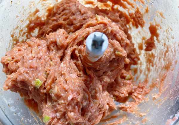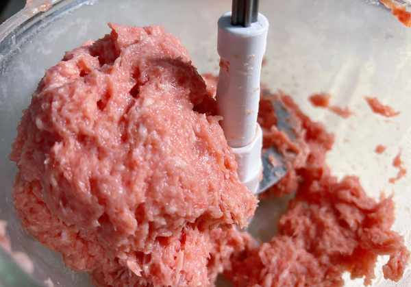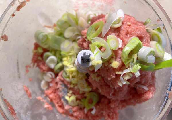 3、接著加入蔥和薑末,繼續開絞肉機攪拌均勻,這樣可以很好地將大蔥與生薑的味道融入肉餡中。