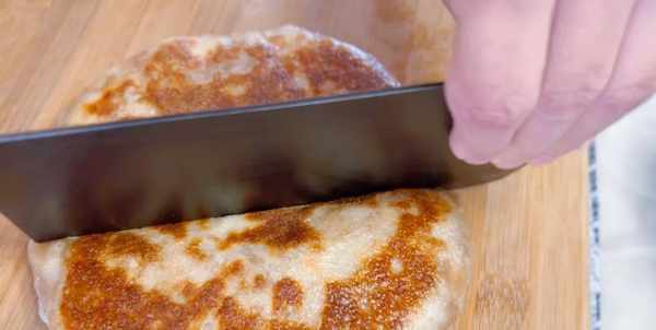 11、烙好之後取出來切成小塊就可以開吃瞭。
