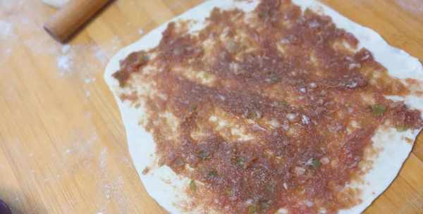 6、將肉餡用勺子均勻地塗抹在面餅上。