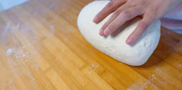 5、面團發酵好之後,放在案板上反復揉一揉排氣。將面團分成等大的小面團,取一個小面團搟成比較薄的面餅。