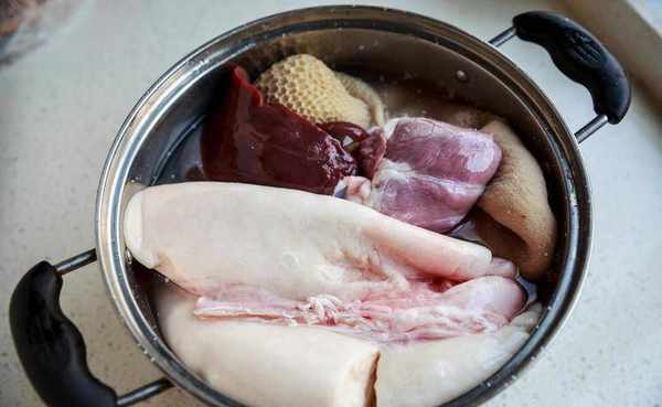 接著把這些切好的羊心,羊肝,羊肺,羊腸,給他冷水下鍋,放蔥薑料酒花椒,冷水下鍋,炒水二分鐘,因為他們做好的半成品裡面很臟,咱們需要焯水個二三分鐘,把浮沫撇出來,浮沫也都是臟東西,撇幹凈之後撈出來,用水清洗幹凈,控幹水分備用。