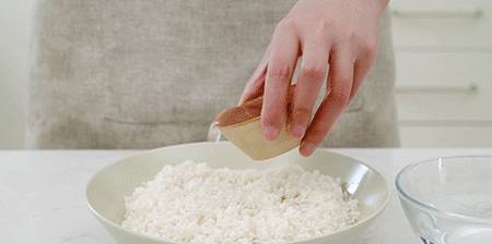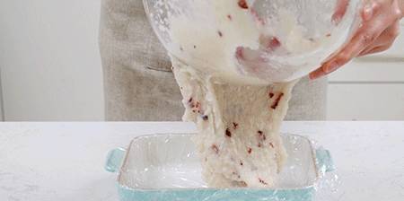 3.蒸好後趁熱取出,再加入蔓越莓幹和白糖攪拌至發粘、米粒模糊,倒入鋪好保鮮膜的模具中,然後用手壓實抹平(可以帶個手套,再沾點飲用水再抹平糯米哦,這樣可以防粘)
